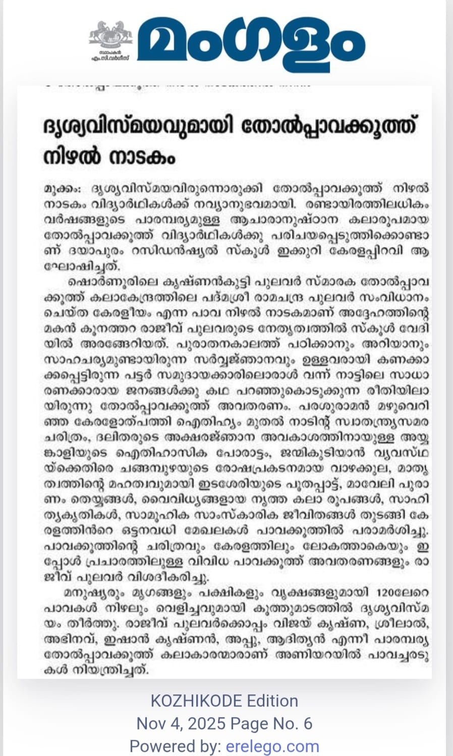 ചാത്തമംഗലം: രണ്ടായിരത്തിലധികം വർഷങ്ങളുടെ പാരമ്പര്യമുള്ള ആചാരാനുഷ്ഠാന കലാരൂപമായ തോല്‍പ്പാവക്കൂത്ത് വിദ്യാർ